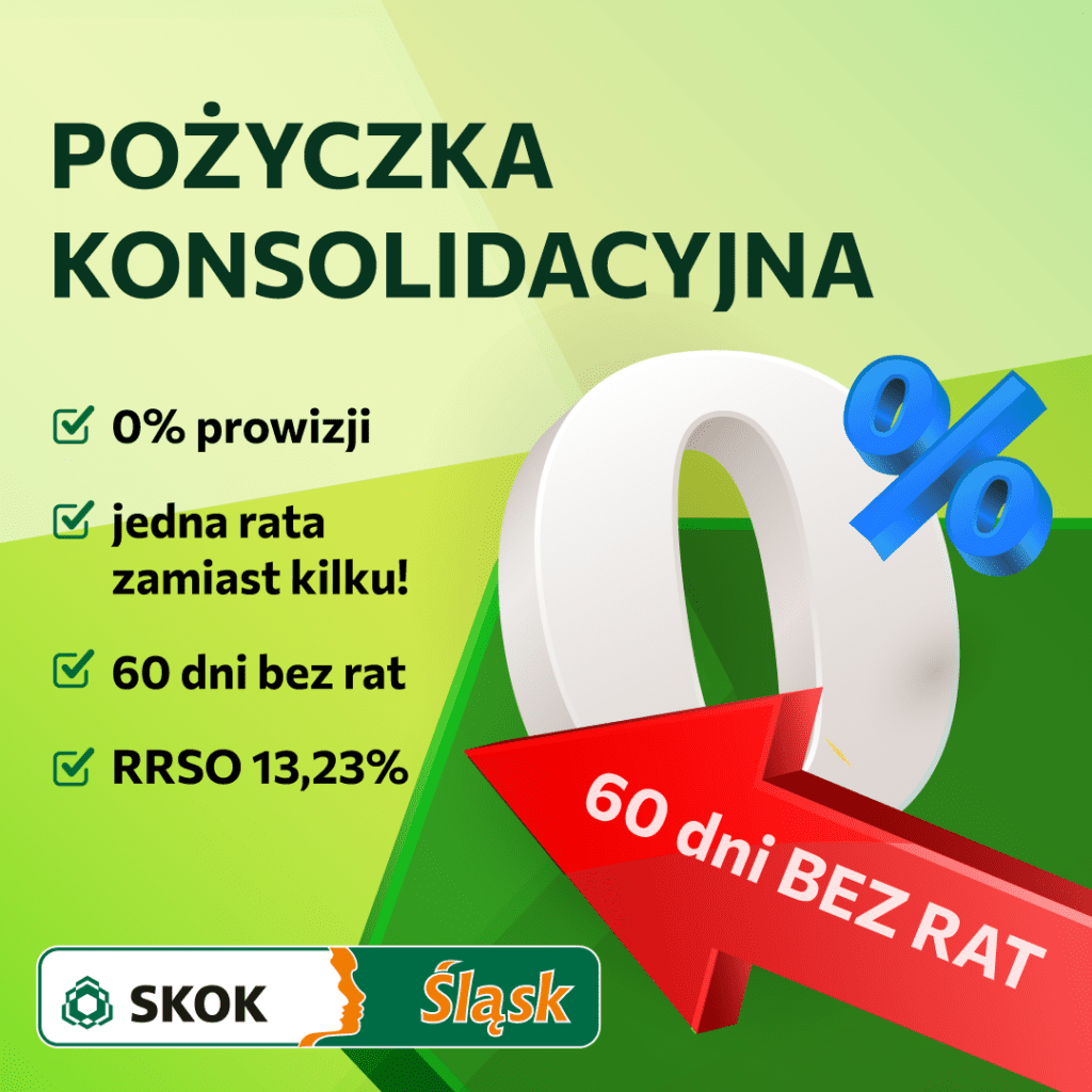 *wyliczenia przy założeniu wypłaty usługi 04.01.2024 roku i płatności pierwszej raty 04.02.2024 roku. Przykład reprezentatywny do pożyczki ZEWNĘTRZNA kwota kredytu: 72 000 zł, czas obowiązywania umowy: 94 miesiące, stopa oprocentowania kredytu w skali roku: 12,49 % (zmienne ), opłata przygotowawcza: 0 zł prowizja: 0,00 zł, koszt ubezpieczenia: 0 zł, opłata za prowadzenie IKS Plus Ponadczasowe: 0 zł za 94 miesiące, rzeczywista roczna stopa oprocentowania (RRSO): 13,23 %, rata: 1 204,70 zł, całkowita kwota do zapłaty:113 241,79 zł, w tym odsetki: 41 241,79 zł. Niniejsza informacja nie stanowi oferty w rozumieniu kodeksu cywilnego. Szczegółowe informację dotyczące warunków udzielenia pożyczki gotówkowej, oprocentowania, opłat i prowizji są dostępne w oddziałach SKOK „Śląsk”. Pożyczka gotówkowa udzielana jest na warunkach i zasadach szczegółowo określonych w umowie zawieranej z klientem. Dostępność pożyczki uzależniona jest od wyniku przeprowadzonej przez SKOK analizy zdolności kredytowej klienta.